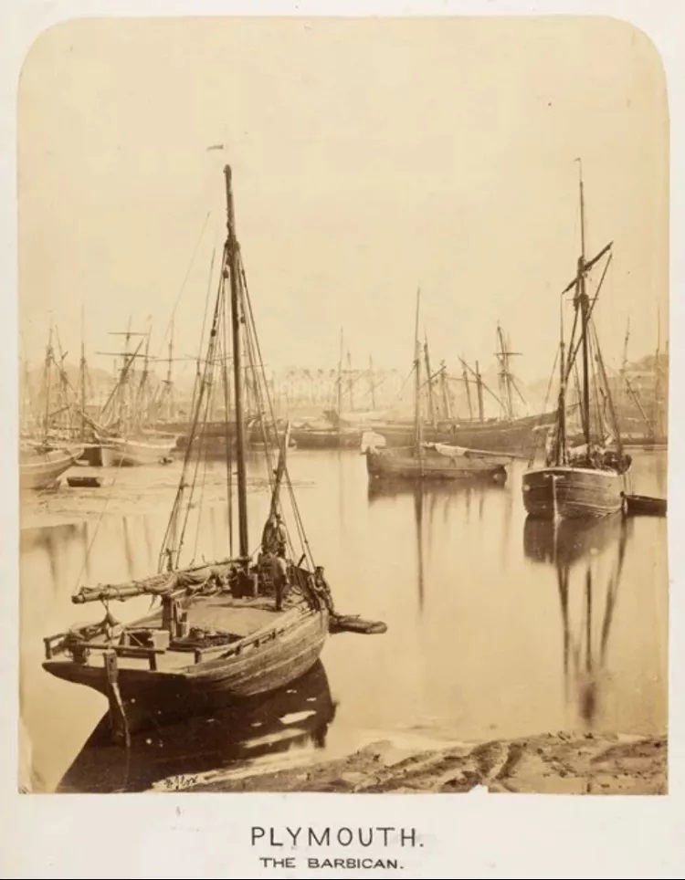 Devon, Plymouth'taki limanda balıkçı tekneleri, arka planda Barbican ile birlikte.Janette Rosing Koleksiyonu