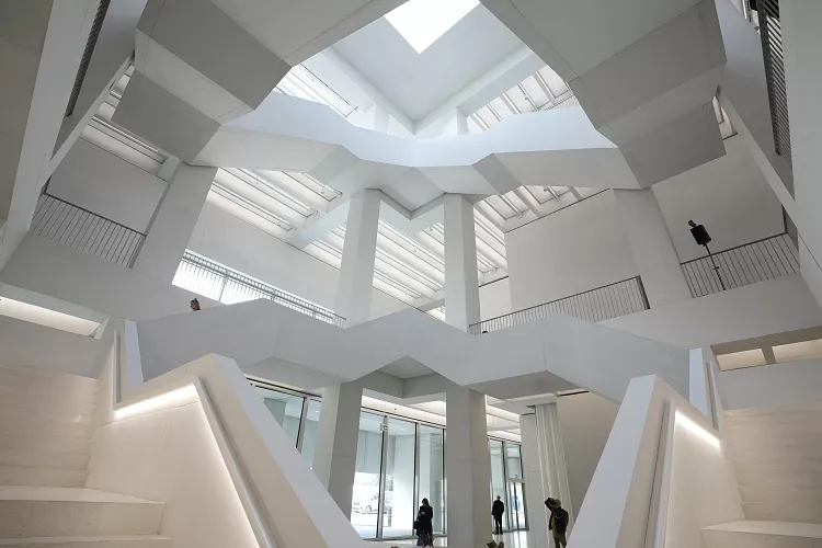 Müze, Varşova'nın ana caddelerinden birinde parlak beyaz bir kutu gibi göze çarpıyor. İçeride, geometrik çizgileriyle dikkat çeken anıtsal merdivenler, geniş pencerelerden süzülen doğal ışıkla aydınlanan galerilere yükseliyor.