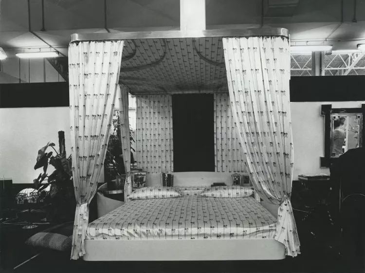 Alain Delon tarafından 1975 yılında tasarlanan, cilalı pirinç bağlantı parçaları ve funda ve kavak ağacından bileşenlere sahip gölgelikli yatak. Kaynak: Salone del Mobile